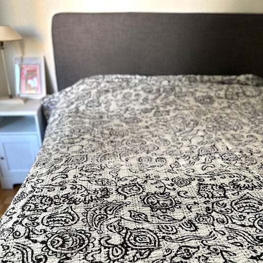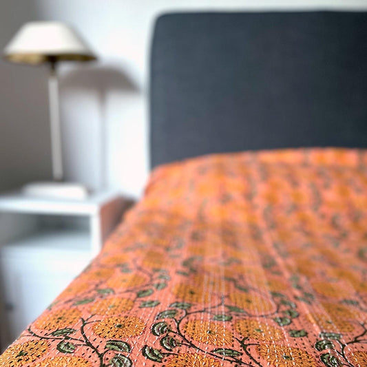 Handmade bedspreads made of cotton. Whether on the sofa or on the bed - the bedspreads from India give your home a unique charm. Our bedspreads contain a lot of handwork, which is characterized by creativity and traditional dedication. The material is made of regional cotton, which is printed by hand during the process. Specially made wooden stamps are used for this. Later, traditional Kantha embroidery is sometimes used, which is also handwork and is believed in Indian belief to provide protection for children and the elderly.