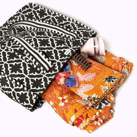 Our bag collection ranges from small bags the size of wallets, to cosmetic and make-up bags in 4 different sizes, to XXL travel bags. You will find hand-printed bags from India, as well as hand-woven bags from Guatemala. Upcycled unique bags made from Banjara fabrics, hand-woven bags made from reeds and colorful Berber bags from Morocco.