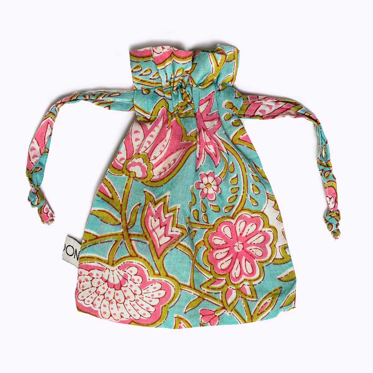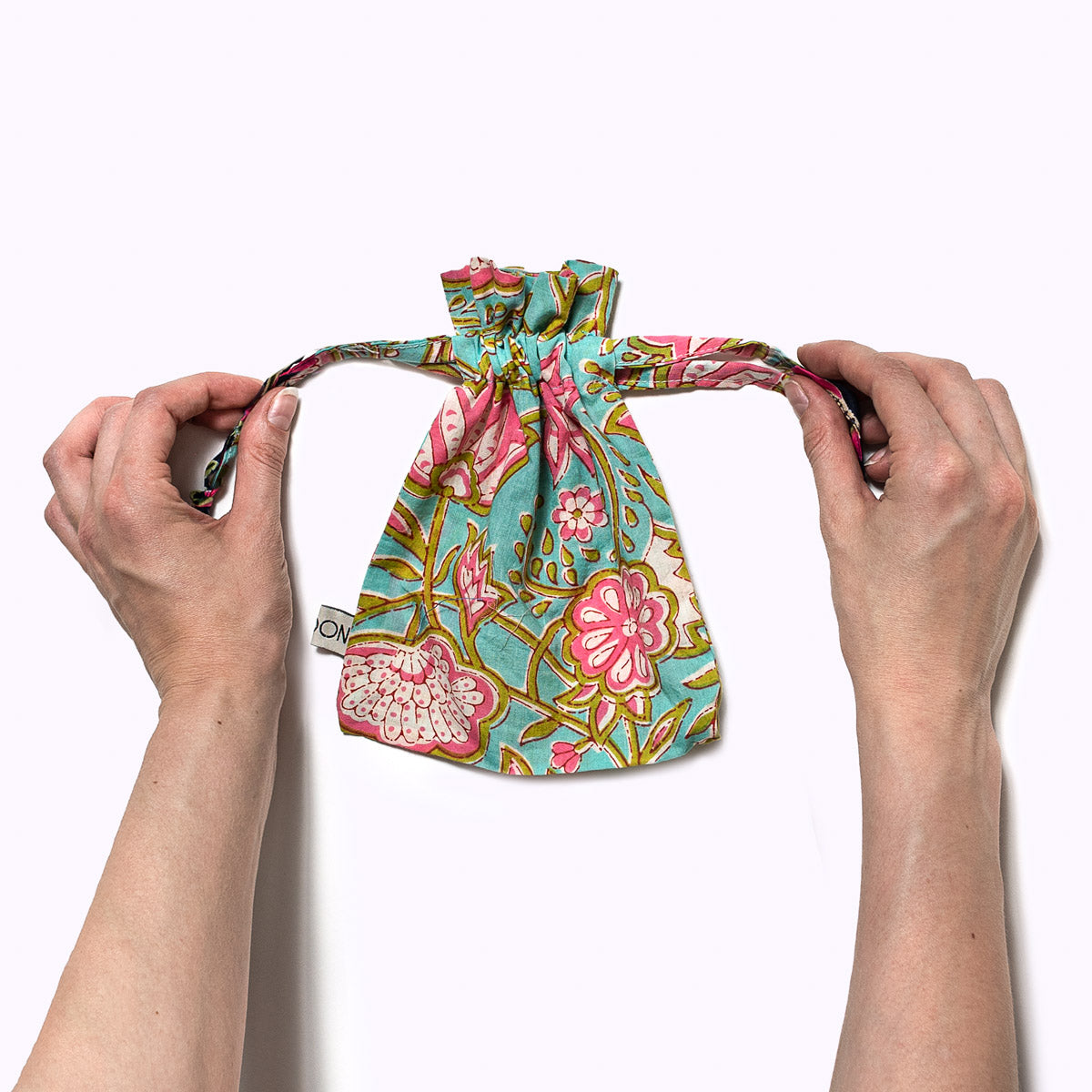 Das verspielte und handgemachte Baumwolltäschchen oder Säckchen "Pink Lotus" kannst du schön verwenden um die ganz kleinen und leichten Essentials, wie Schmuck oder Haarspangen schön zu verwahren und unterzubringen. Ein schönes kleines ADD ON für viele Gelegenheiten. Das Schönste: Jedes Täschchen ist ein Einzelstück und wird mit viel Liebe in Indien hergestellt. Die Mitarbeiter bedrucken den reinen Baumwollstoff mit Holzstempeln von Hand. Dieses Verfahren wird Blockprint genannt.
