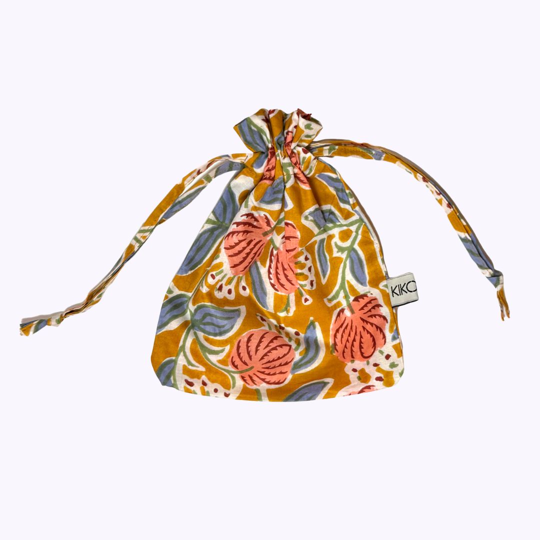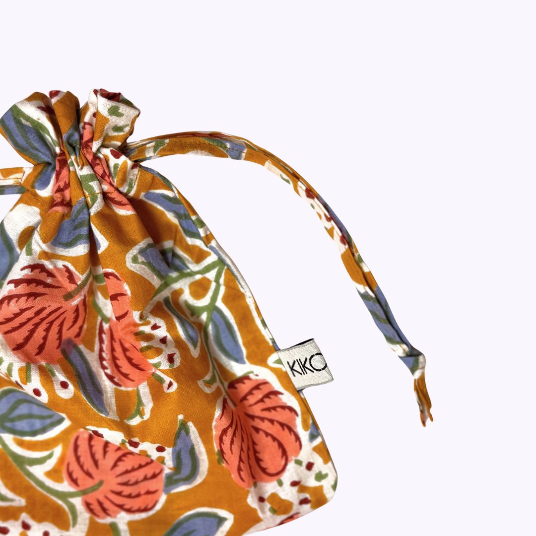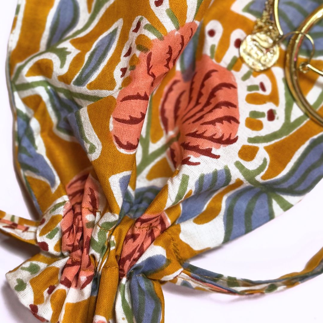 Das verspielte und handgemachte Baumwolltäschchen oder Säckchen "Tuscany Dreams" kannst du schön verwenden um die ganz kleinen und leichten Essentials, wie Schmuck oder Haarspangen schön zu verwahren und unterzubringen. Ein schönes kleines ADD ON für viele Gelegenheiten. Das Schönste: Jedes Täschchen ist ein Einzelstück und wird mit viel Liebe in Indien hergestellt. Die Mitarbeiter bedrucken den reinen Baumwollstoff mit Holzstempeln von Hand. Dieses Verfahren wird Blockprint genannt.