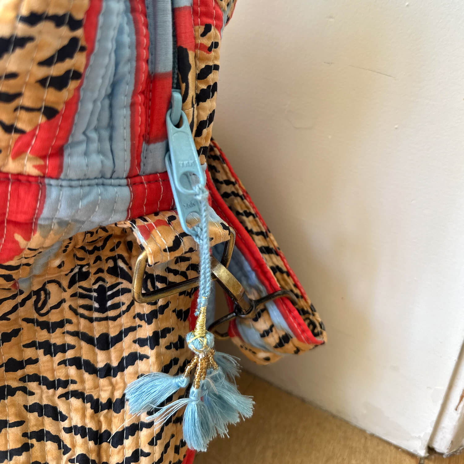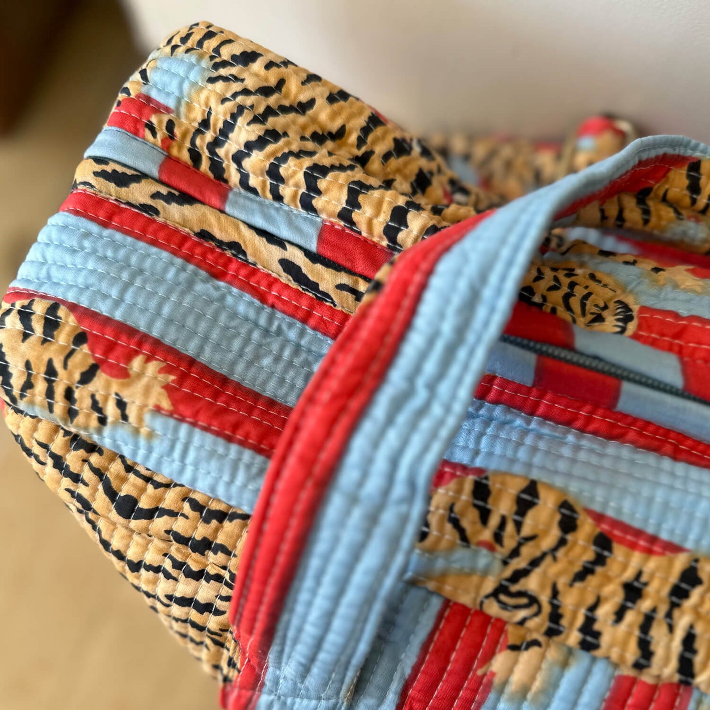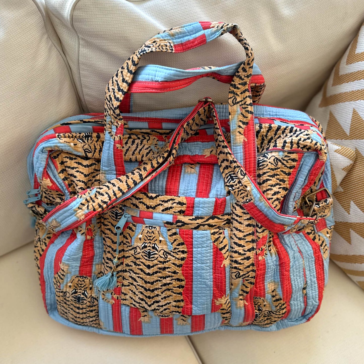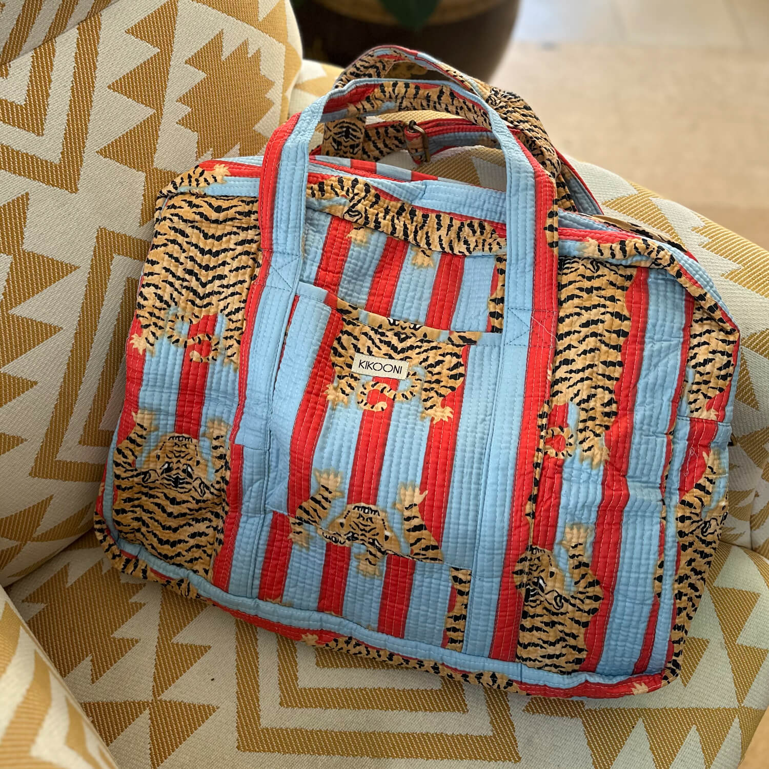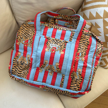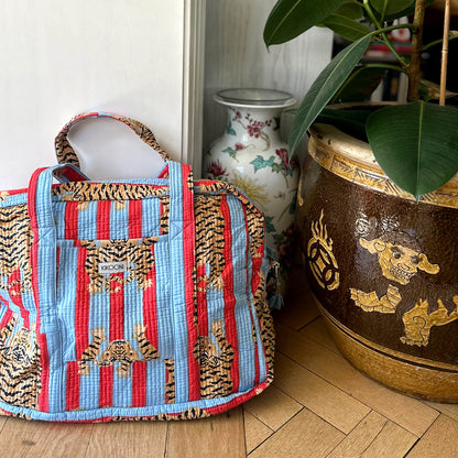 in deiner handgemachten Reisetasche "Poppy Tiger Funky" kannst du alles unterbringen was du für einen mehrtätigen Trip benötigst und sparst dir wertvolle Zeit am Flughafen. Du musst dieses Raumwunder nämlich noch nicht mal aufgeben, weil sie Handgepäck Größe hat! Du kannst mit Leichtigkeit einen Teil deiner Garderobe, XL Handtuch, deine Turnschuhe, Laptop, sowie noch deine KIKOONI Bag in Bag unterbringen. In deiner flexiblen und leichten Baumwolltasche findet wirklich alles Platz was du für einen Kurzurlaub oder einen Businesstrip brauchst. Die Reisetasche ist perfekt geeignet um deine wichtigsten und schönsten Teile unterzubringen. Die verstellbaren Gurte, mit der du deine Lieblingstasche auch crossbody tragen kannst, kannst du auch abnehmen und die Tasche als Schultertasche tragen. Das Mit- Schönste : deine Reisetasche besitzt eine Schlaufe mit der du sie perfekt an deinen Rollgepäckgriff "aufstecken" kannst. Und jetzt kommt das wirklich Schönste : jede dieser Taschen ist ein Einzelstück und wird mit viel Liebe in Indien hergestellt. Die Mitarbeiter bedrucken den reinen Baumwollstoff mit Holzstempeln oder mit dem Siebdruck Verfahren von Hand. Dieses Verfahren wird Blockprint oder Screenprint genannt. Anschliessend besticken sie die Tasche mit der berühmten und traditionellen Kantha-Stickerei und finalisieren sie mit den Quasten-Details am Reissverschluss. Die handgemachte Reisetasche"Poppy Tiger Funky" ist bis ins kleinste Detail durchdacht und hebt sich federleicht vom Mainstream ab.