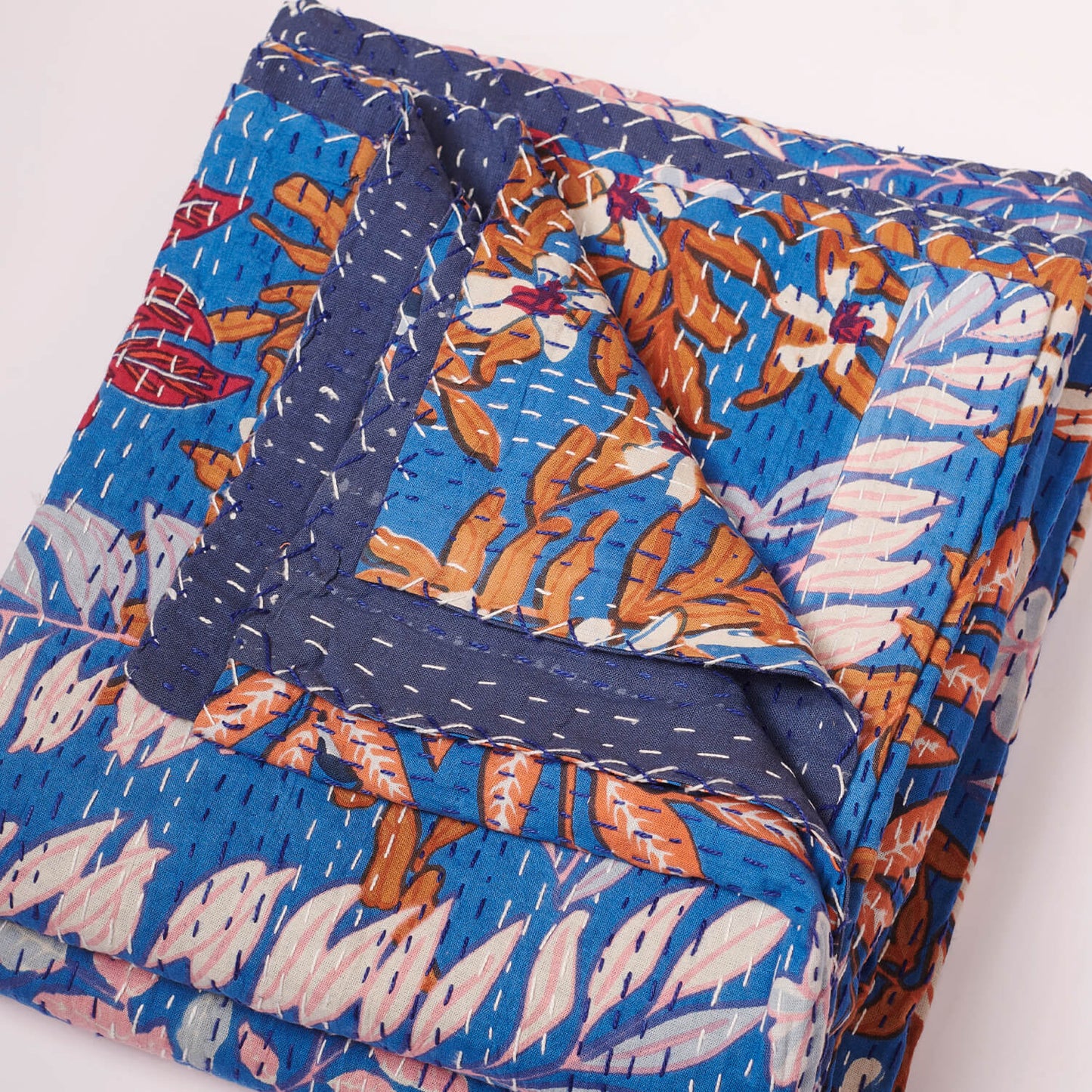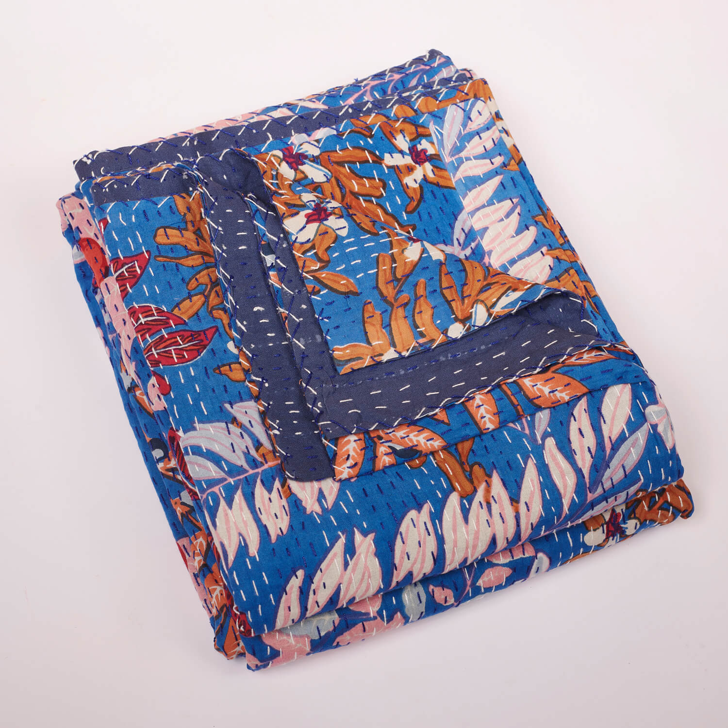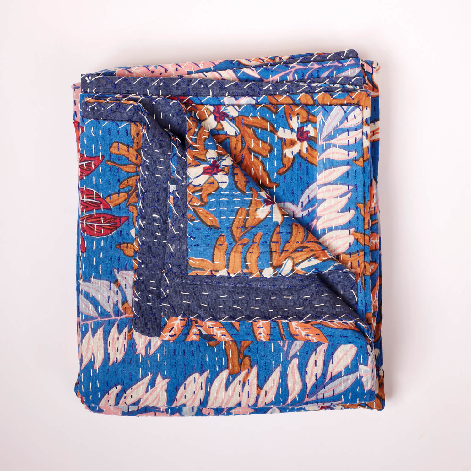 XL – Tagesdecke “IN THE FOREST". Ob auf dem Sofa oder auf dem Bett – die Überdecken aus Indien verleihen dem Zuhause einen einzigartigen Charme. In den farbenfrohen Überdecken steckt viel Handarbeit, die von Kreativität und traditioneller Hingabe geprägt sind. Das Material ist aus reiner und hochwertiger Baumwolle, welche im Prozess von Hand bedruckt wird. Dafür werden eigens angefertigte Holzstempel verwendet. Später wird die traditionelle Kantha-Stickerei angewandt, welche ebenfalls Handarbeit ist und im indischen Glaube besagt, Schutz für Kinder und alte Menschen zu sein.