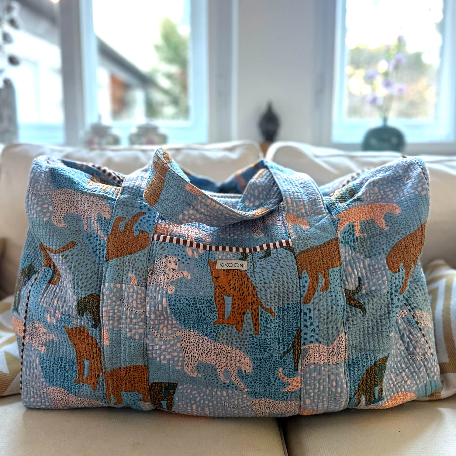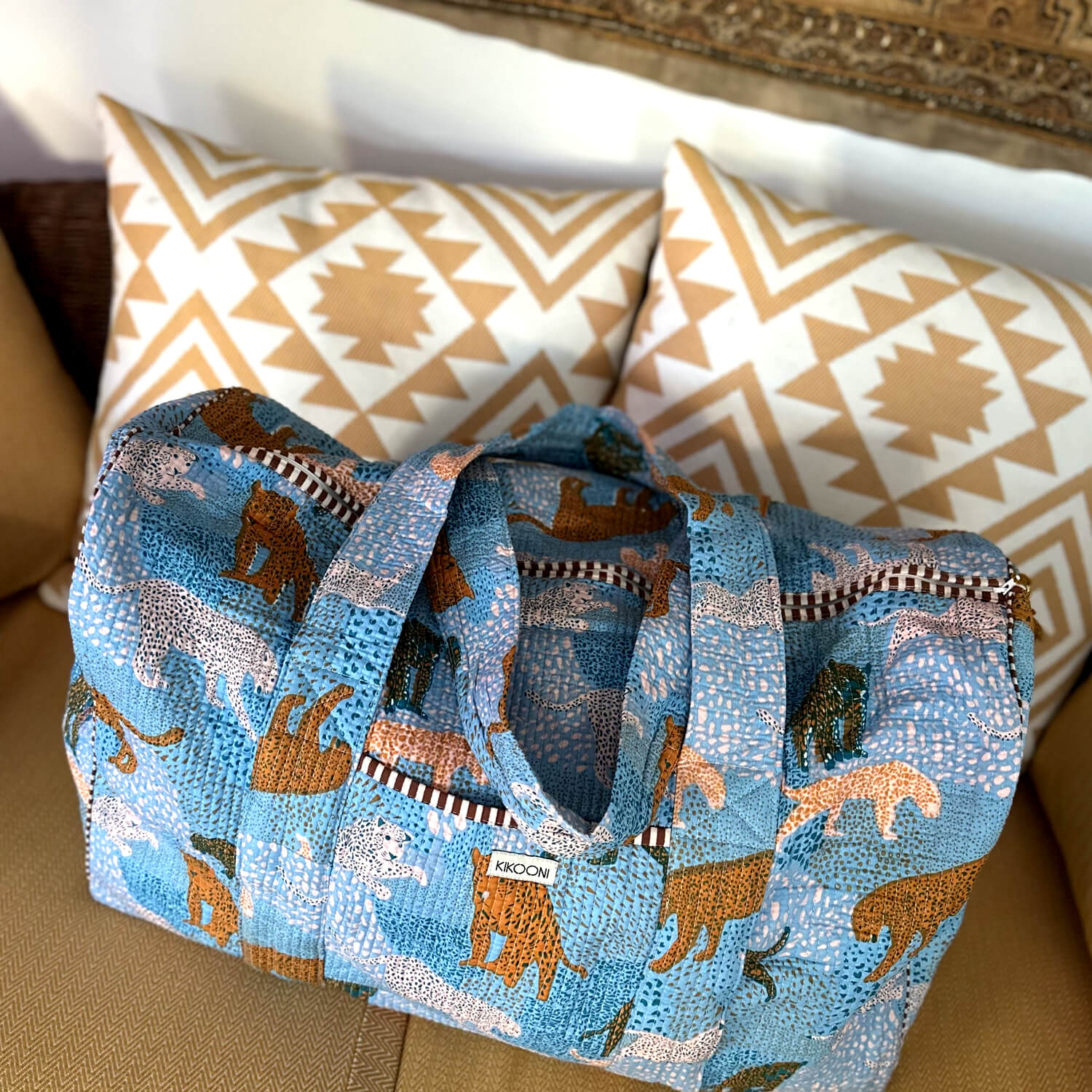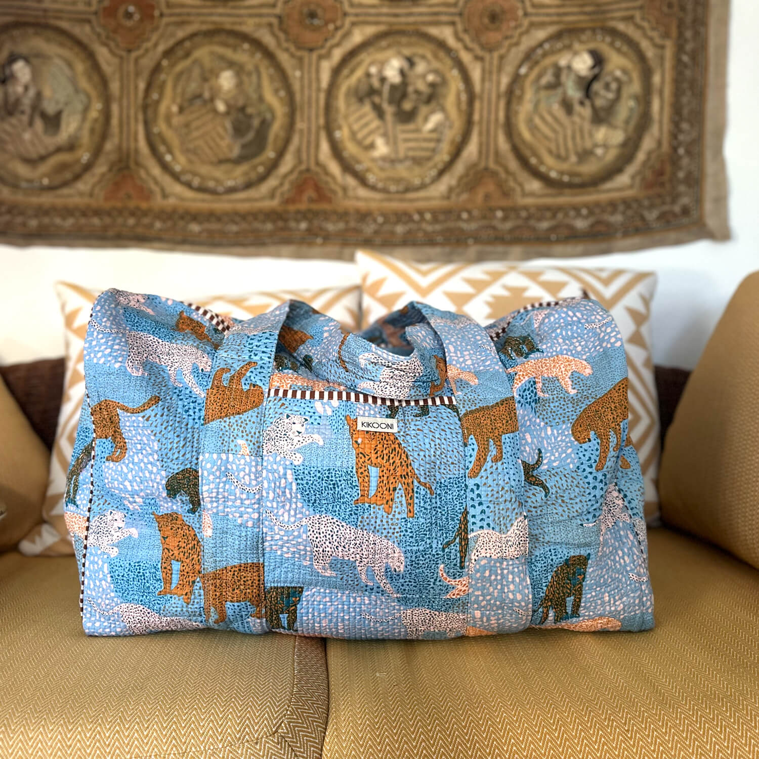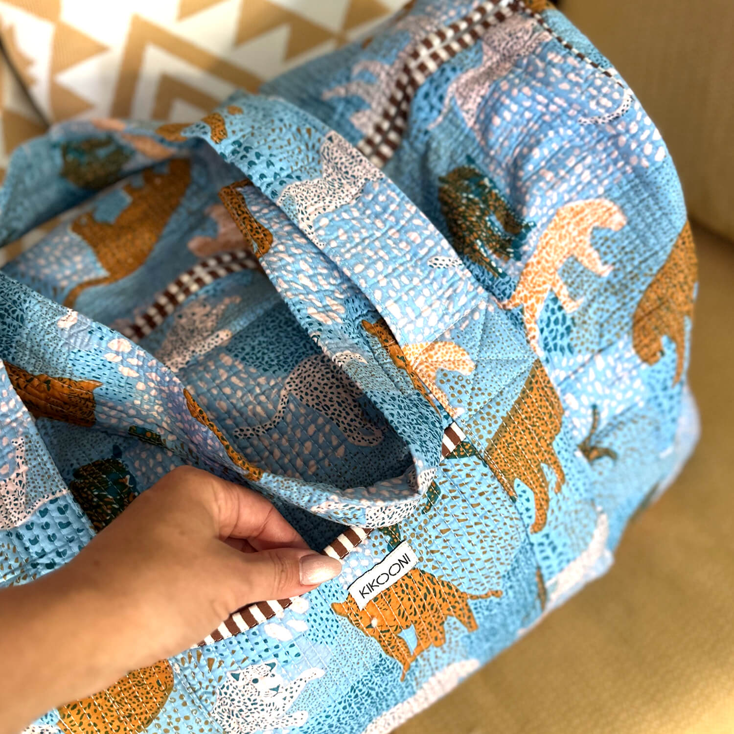 in deiner handgemachten XXL Familien Badetasche "LUCKY LEO BLUE" kannst du alles unterbringen was du für einen Strandausflug oder den Ausflug ins Freibad brauchst. Hier bekommst du als 2-8 köpfige Familie ALLES unter ;) Da die Tasche super flexibel und leicht ist kannst du hier wirklich alles verstauen was du für einen Ausflug ans Meer , den See oder ins Freibad benötigst. Hier passen Schwimmflügel, Schwimmhilfen wie Schwimmgurte oder aufblasbare Wasserspielzeuge und noch die Taucherbrillen oder die Schnorchelausrüstung rein. Unsere XXL Familientasche "LUCKY LEO BLUE" hat Platz für eure Handtücher und Sonnencremes, Ersatzklamotten, sowie noch Trinken und Snacks.Und nach dem Strand- , See oder Freibad Ausflug kannst du die Tasche einfach ( bei max 40 Grad) mit den Badesachen in die Waschmaschine schmeißen. Unkomplizierter und stilsicherer geht es nicht! Das Schönste : jede dieser Taschen ist ein Einzelstück und wird mit viel Liebe in Indien hergestellt. Die Mitarbeiter bedrucken den reinen Baumwollstoff mit Holzstempeln von Hand. Dieses Verfahren wird Blockprint genannt. Anschliessend besticken sie die Tasche mit der berühmten und traditionellen Kantha-Stickerei und finalisieren sie mit den Quasten-Details am Reissverschluss. Die handgemachte XXL Strandtasche "LUCKY LEO BLUE" ist bis ins kleinste Detail durchdacht und hebt sich federleicht vom Mainstream ab.Fair, ressourcenschonend und mit kreativem Spirit
