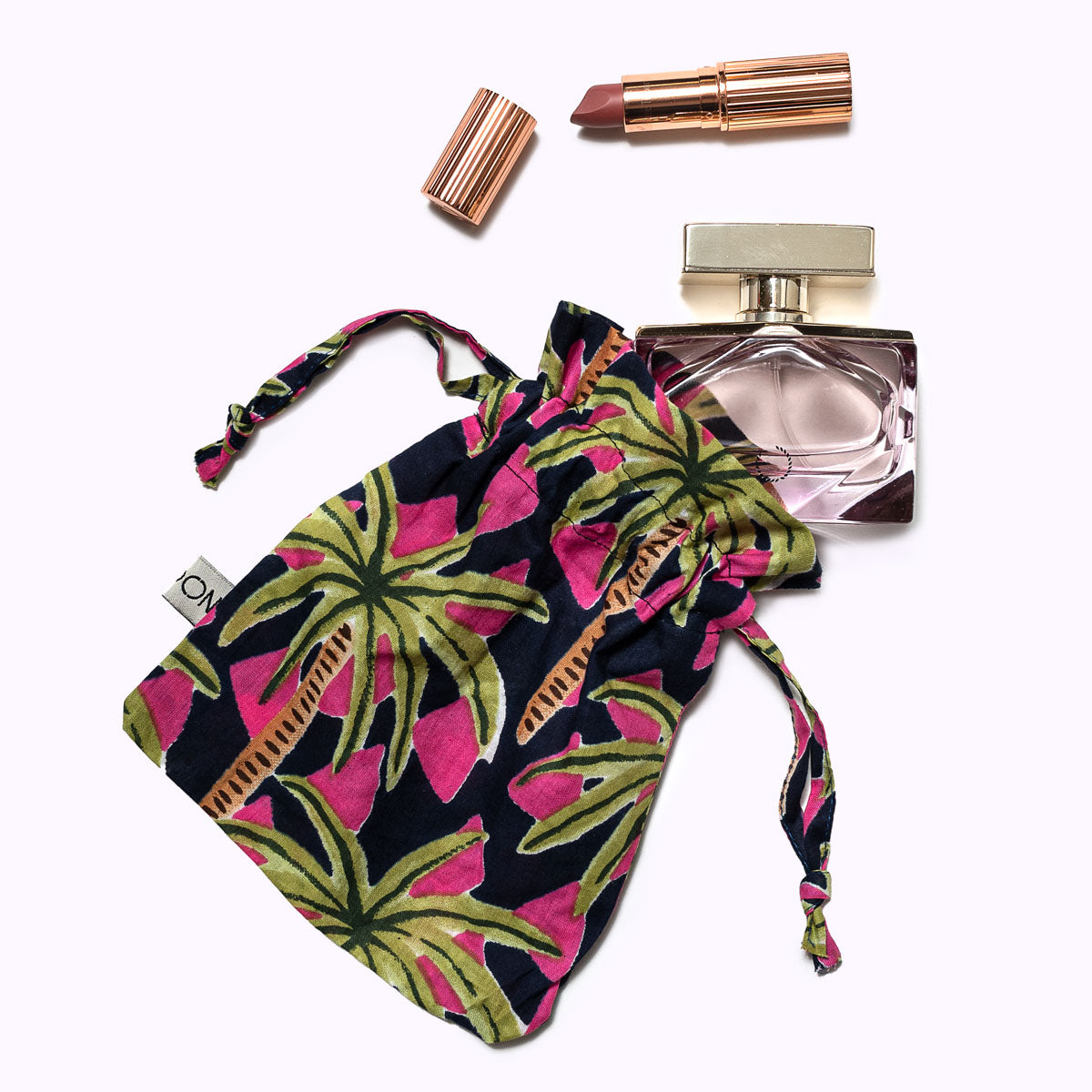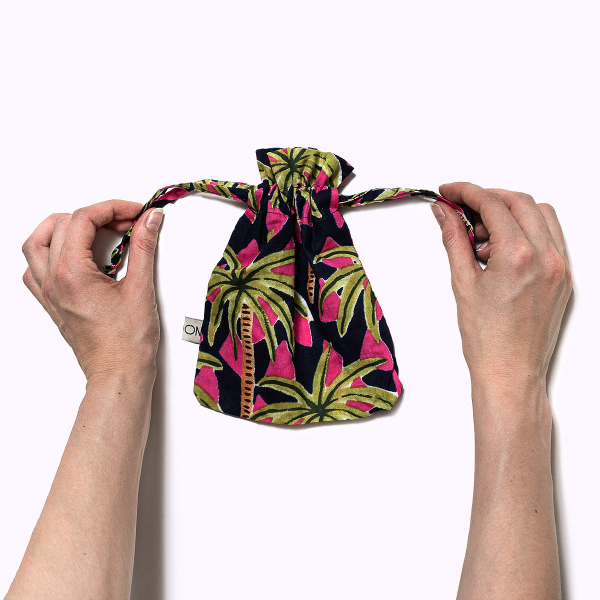 Das verspielte und handgemachte Baumwolltäschchen oder Säckchen "Palms by Night" kannst du schön verwenden um die ganz kleinen und leichten Essentials, wie Schmuck oder Haarspangen schön zu verwahren und unterzubringen. Ein schönes kleines ADD ON für viele Gelegenheiten. Das Schönste: Jedes Täschchen ist ein Einzelstück und wird mit viel Liebe in Indien hergestellt. Die Mitarbeiter bedrucken den reinen Baumwollstoff mit Holzstempeln von Hand. Dieses Verfahren wird Blockprint genannt.