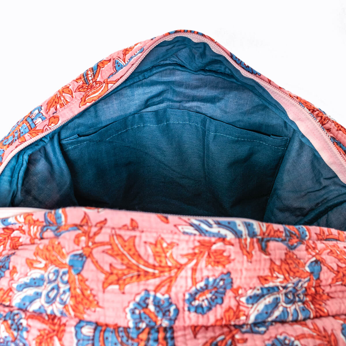 Im Herstellungsprozess werden keine tierischen Produkte verwendet und die Baumwollstoffe werden von Hand mit einem Holzstempel bedruckt. Da die Mitarbeiter die Kantha Bestickung aus Baumwollfäden mit der Nähmaschine anbringen und der Innenteil per Nähmaschine eingenäht wird, entsteht ein rein veganes Produkt.