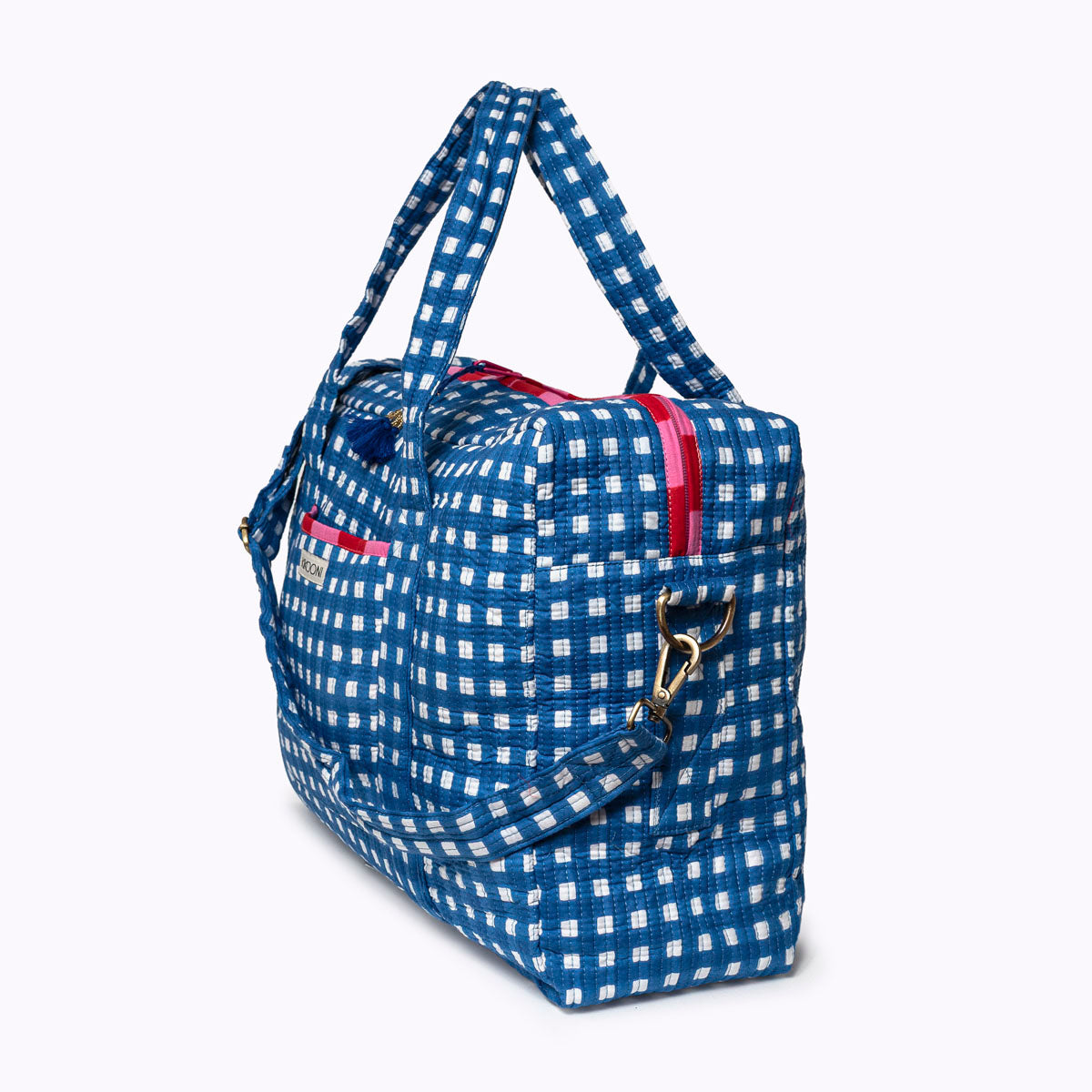 "Happy Checks" blue kannst du alles unterbringen was du für einen mehrtätigen Trip benötigst und sparst dir wertvolle Zeit am Flughafen. Du musst dieses Raumwunder nämlich noch nicht mal aufgeben, weil sie Handgepäck Größe hat! Du kannst mit Leichtigkeit einen Teil deiner Garderobe, XL Handtuch, deine Turnschuhe, Laptop, sowie noch deine KIKOONI Bag in Bag unterbringen. In deiner flexiblen und leichten Baumwolltasche findet wirklich alles Platz was du für einen Kurzurlaub oder einen Businesstrip brauchst. Die Reisetasche ist perfekt geeignet um deine wichtigsten und schönsten Teile unterzubringen. Die verstellbaren Gurte, mit der du deine Lieblingstasche auch crossbody tragen kannst, kannst du auch abnehmen und die Tasche als Schultertasche tragen. Das Mit- Schönste : deine Reisetasche besitzt eine Schlaufe mit der du sie perfekt an deinen Rollgepäckgriff "aufstecken" kannst. Und jetzt kommt das wirklich Schönste : jede dieser Taschen ist ein Einzelstück und wird mit viel Liebe in Indien hergestellt. Die Mitarbeiter bedrucken den reinen Baumwollstoff mit Holzstempeln oder mit dem Siebdruck Verfahren von Hand. Dieses Verfahren wird Blockprint oder Screenprint genannt. Anschliessend besticken sie die Tasche mit der berühmten und traditionellen Kantha-Stickerei und finalisieren sie mit den Quasten-Details am Reissverschluss. Die handgemachte Reisetasche
