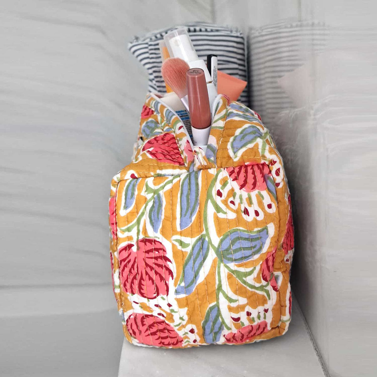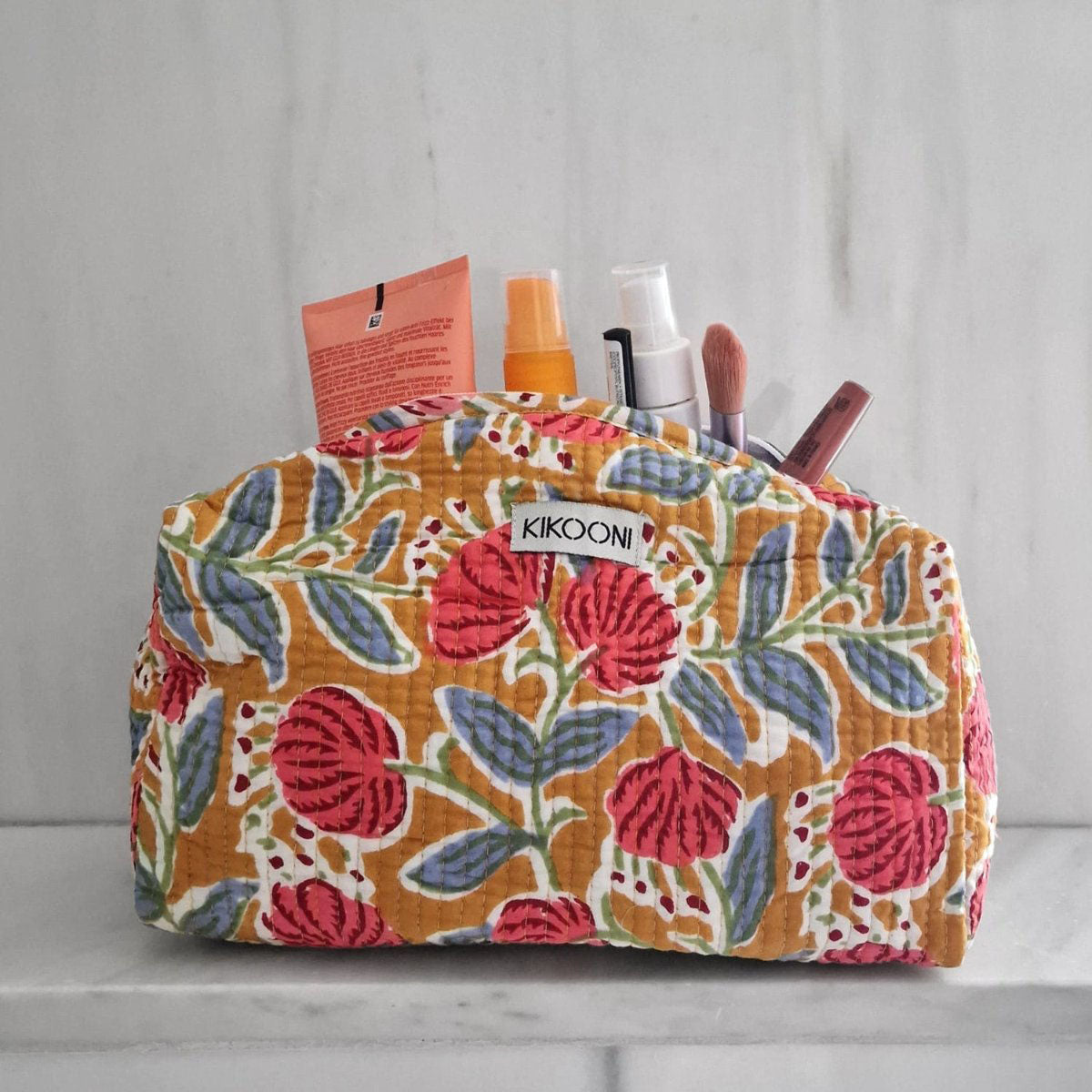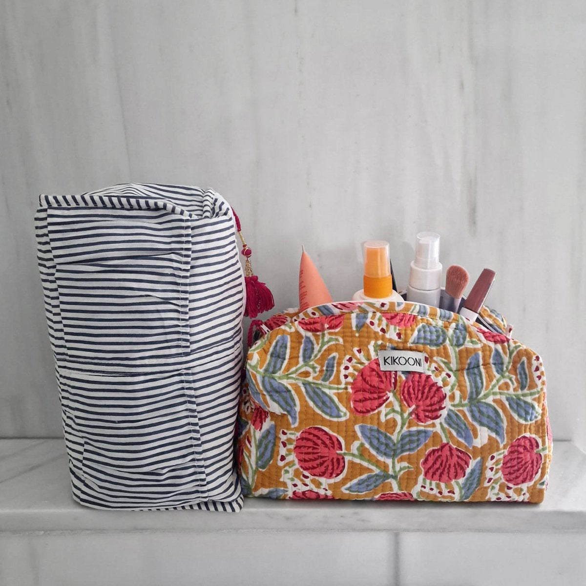 Liebevolle Handarbeit und einzigartige Details! Die verspielte und handgemachte Kosmetiktasche "Tuscany Dreams"ist eine wunderbare Ergänzung zur großen (Kultur)tasche. Da du sie perfekt in einr Handtasche unterbringen kannst, ist sie perfekt geeignet deine Must-haves wie Handcreme, Lippenstift und Sonnencreme organisiert und griffbereit zu verwahren . Das schönste: Jede Kosmetiktasche ist ein Einzelstück und wird mit viel Liebe in Indien hergestellt. Die Mitarbeiter bedrucken den reinen Baumwollstoff mit Holzstempeln von Hand. Dieses Verfahren wird Blockprint genannt. Anschliessend besticken die Tasche mit der berühmten und tradiotionellen Kantha-Stickerei bestickt und finalisieren die Tasche mit den Quasten-Details am Reissverschluss . Die handgemachte Kosmetiktasche "Tuscany Dreams" ist bis ins kleinste Detail durchdacht und hebt sich federleicht vom Mainstream ab.