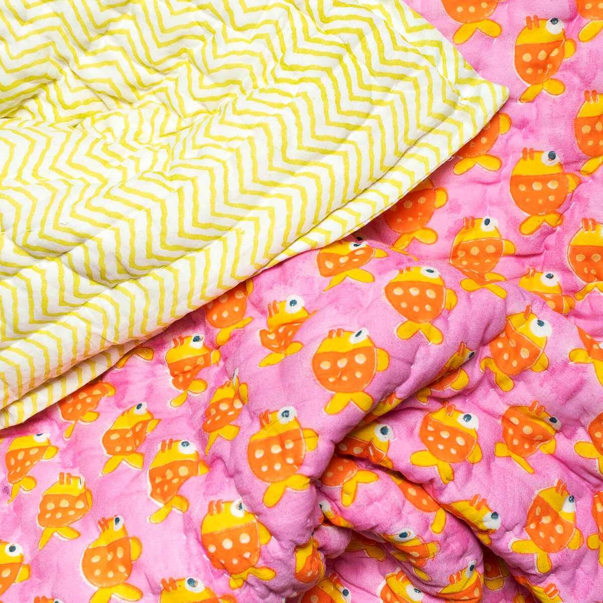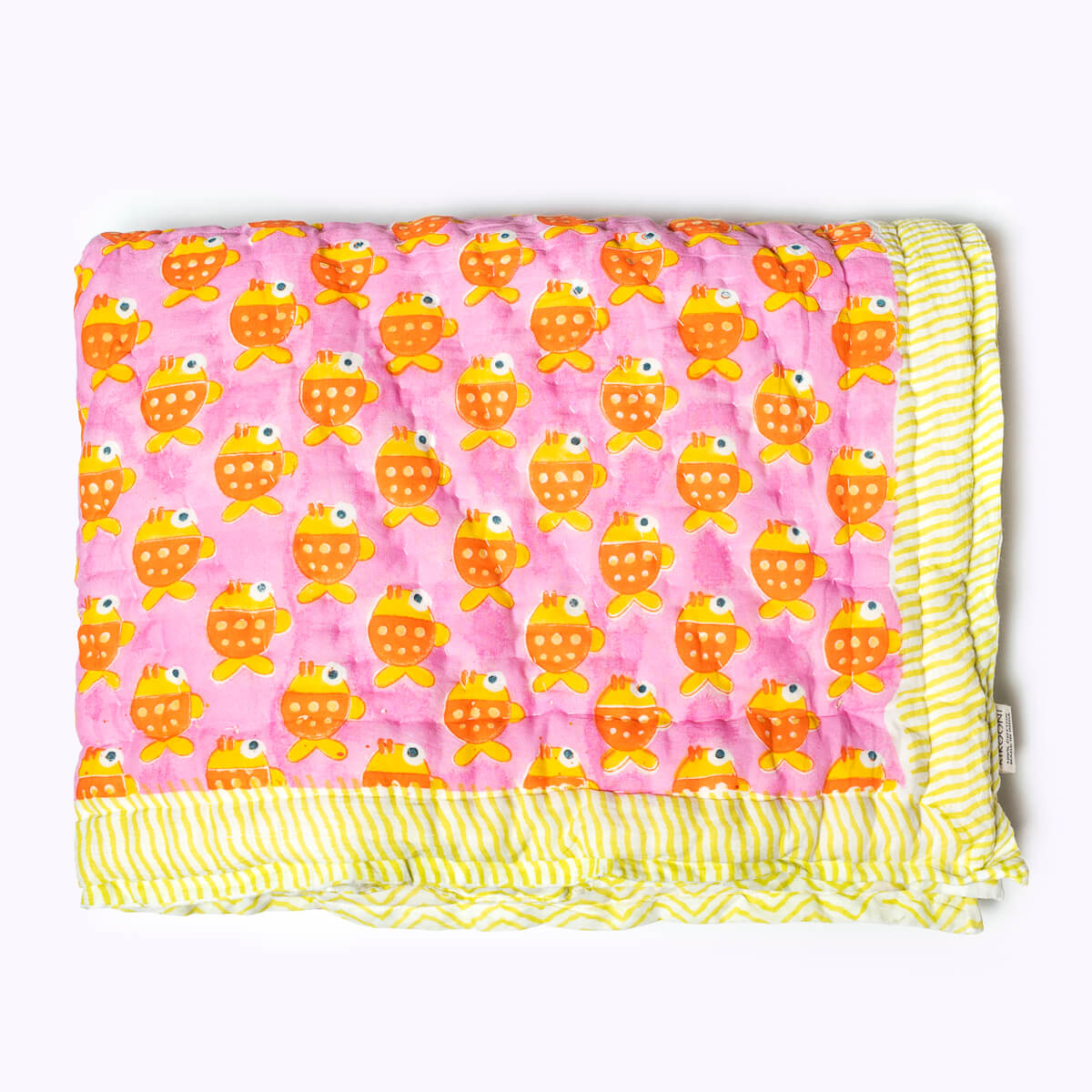 Kuscheldecke und Kinder - Tagesdecke "poppy Fish" . Unsere Baby Quilts und Tagesdecken sind aus 100% Baumwolle hergestellt und mit einer leichten und lockeren Baumwollschicht gefüttert. Ob auf dem Sofa oder auf dem Bett – die Tagesdecken aus Indien verleihen dem Kinderzimmer , wie dem Wohnzimmer einen einzigartigen Charme. Du kannst sie auch als Picknick Decke verwenden. Die Decken sind aus 100% Baumwolle und waschbar. In den farbenfrohen Überdecken steckt viel Handarbeit, die von Kreativität und traditioneller Hingabe geprägt sind. Das Material ist aus reiner und hochwertiger Baumwolle, welche im Prozess von Hand bedruckt wird. Dafür werden eigens angefertigte Holzstempel verwendet.