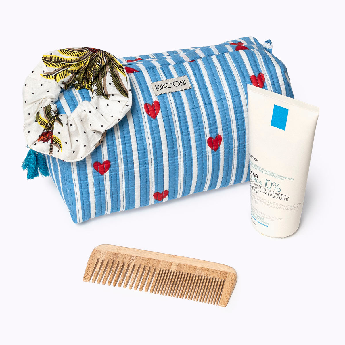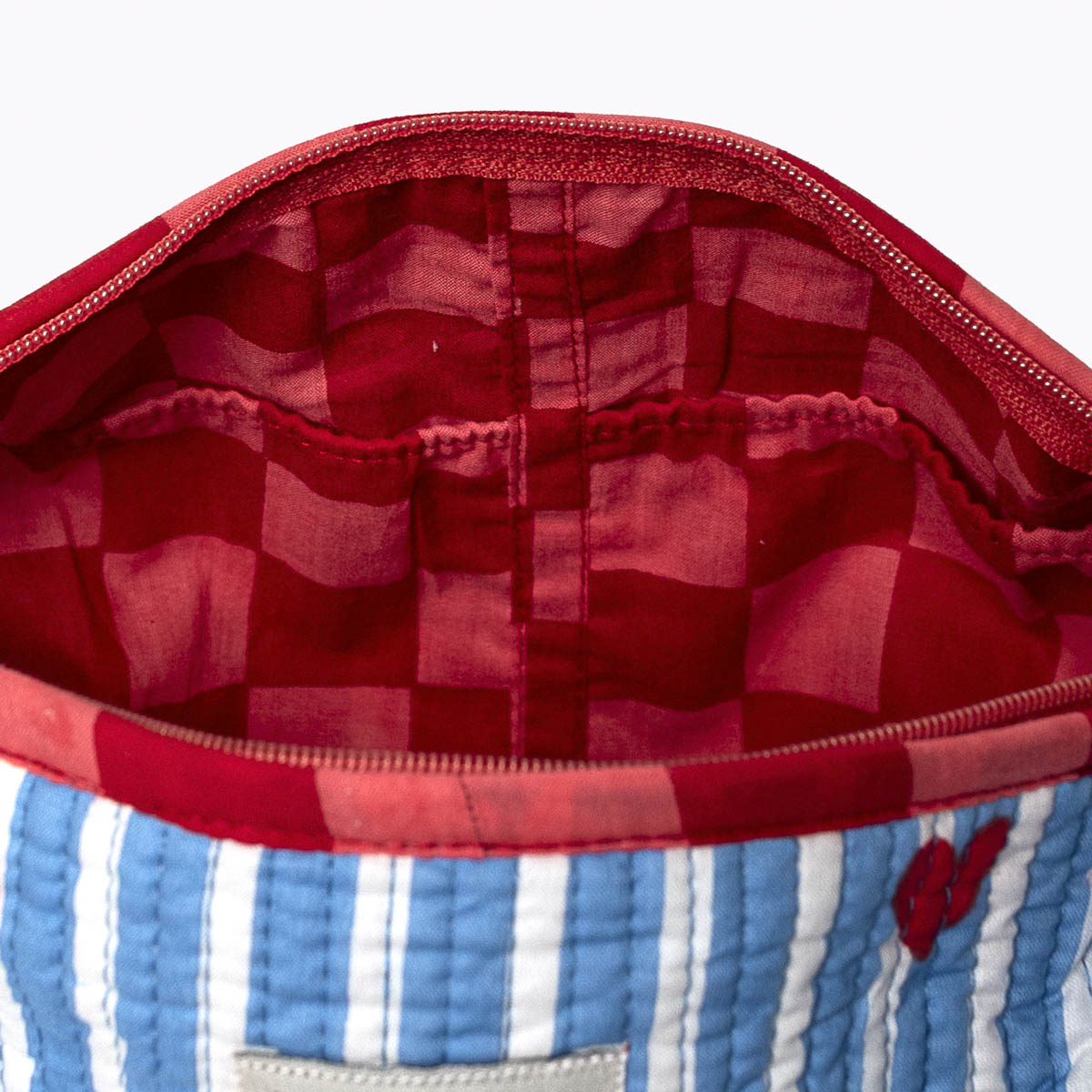 Liebevolle Handarbeit und einzigartige Details! Die verspielte und handgemachte Kosmetiktasche "LOVE Edition" blue ist eine wunderbare Ergänzung zur großen (Kultur)tasche. Da du sie perfekt in einer Handtasche unterbringen kannst, ist sie perfekt geeignet deine Must-haves wie Handcreme, Lippenstift und Sonnencreme organisiert und griffbereit zu verwahren . Das schönste: Jede Kosmetiktasche ist ein Einzelstück und wird mit viel Liebe in Indien hergestellt. Die Mitarbeiter bedrucken den reinen Baumwollstoff mit Holzstempeln von Hand. Dieses Verfahren wird Blockprint genannt. Anschliessend besticken die Tasche mit der berühmten und traditionellen Kantha-Stickerei bestickt und finalisieren die Tasche mit den Quasten-Details am Reissverschluss . Die handgemachte Kosmetiktasche "LOVE Edition" blue ist bis ins kleinste Detail durchdacht und hebt sich federleicht vom Mainstream ab.