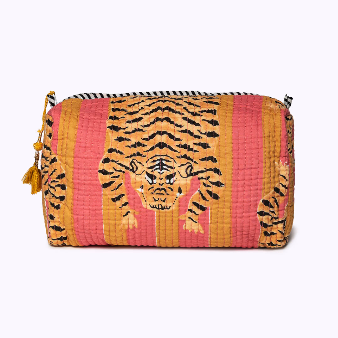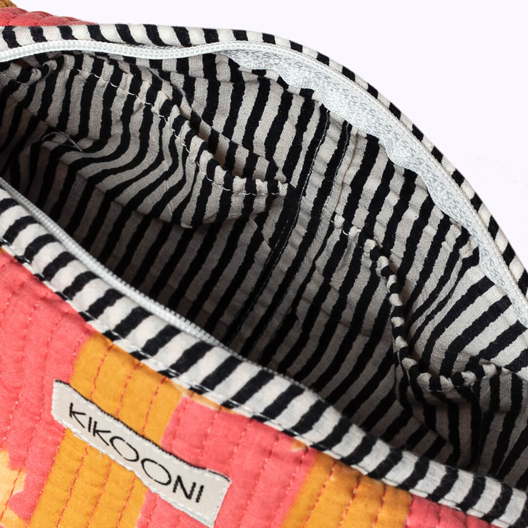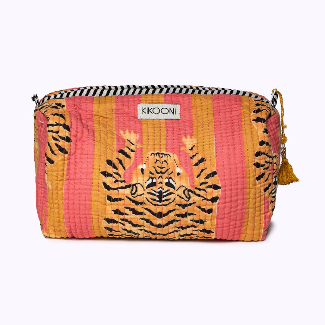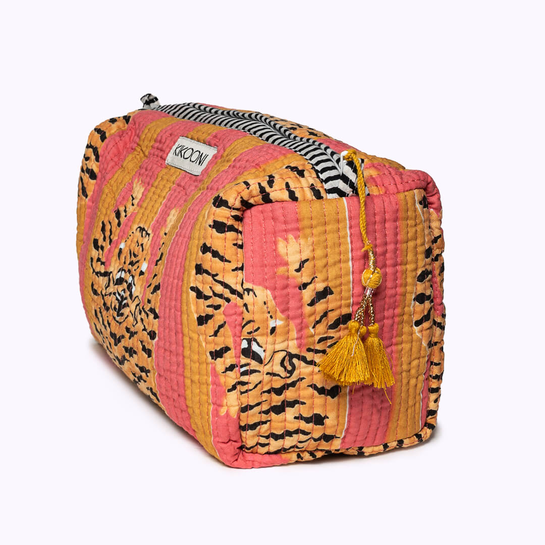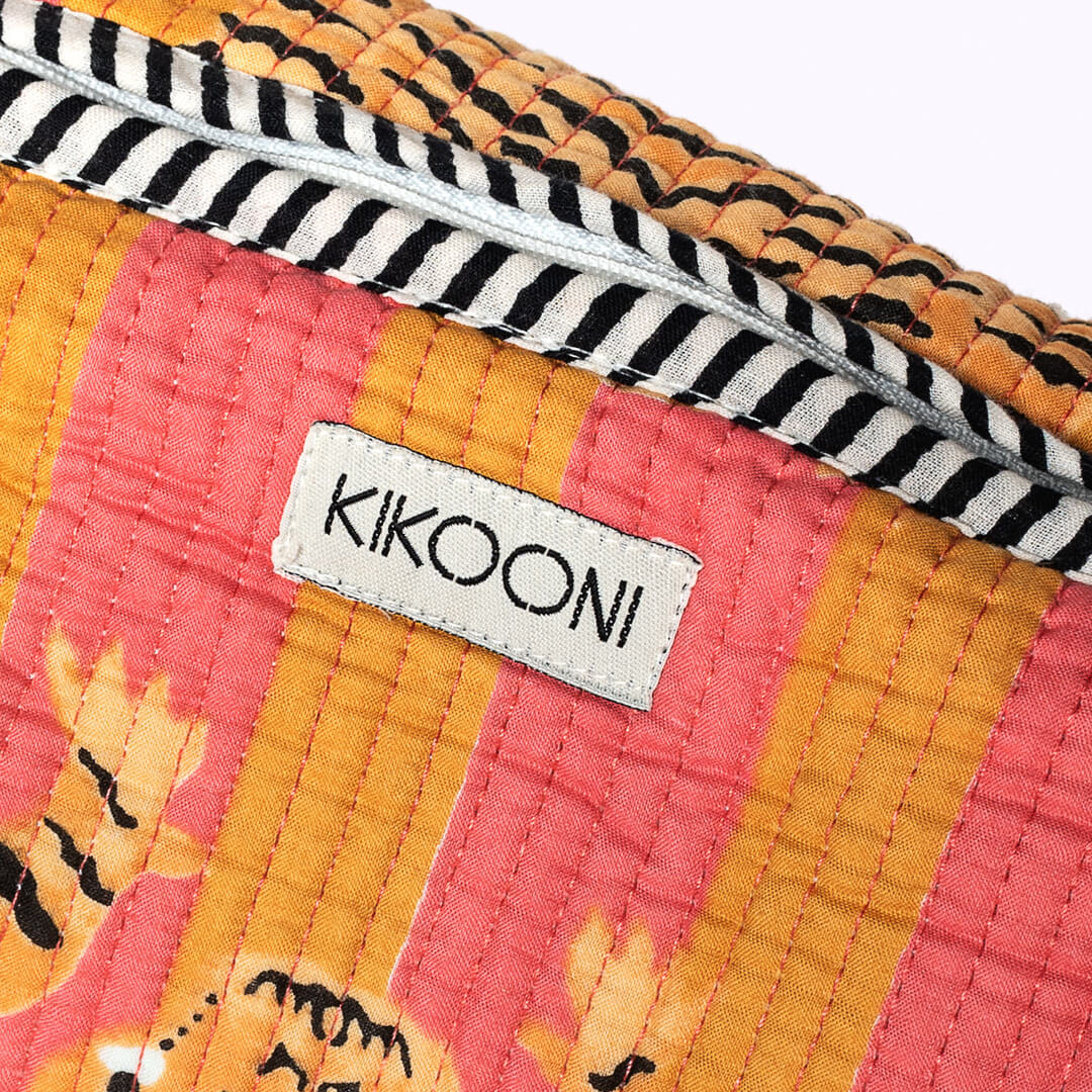 Liebevolle Handarbeit und einzigartige Details! Die verspielte und handgemachte Kosmetiktasche "Poppy Tiger Sunset" ist eine wunderbare Ergänzung zur großen (Kultur)tasche. Da du sie perfekt in einer Handtasche unterbringen kannst, ist sie perfekt geeignet deine Must-haves wie Handcreme, Lippenstift und Sonnencreme organisiert und griffbereit zu verwahren . Das schönste: Jede Kosmetiktasche ist ein Einzelstück und wird mit viel Liebe in Indien hergestellt. Die Mitarbeiter bedrucken den reinen Baumwollstoff mit Holzstempeln von Hand. Dieses Verfahren wird Blockprint genannt. Anschliessend besticken die Tasche mit der berühmten und traditionellen Kantha-Stickerei bestickt und finalisieren die Tasche mit den Quasten-Details am Reissverschluss . Die handgemachte Kosmetiktasche "Poppy Tiger Sunset" ist bis ins kleinste Detail durchdacht und hebt sich federleicht vom Mainstream ab.