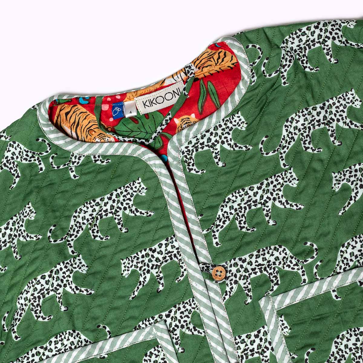 • Eine Jacke, zwei Looks: außen eleganter Green Leopard, innen wilder Jungle Tiger.