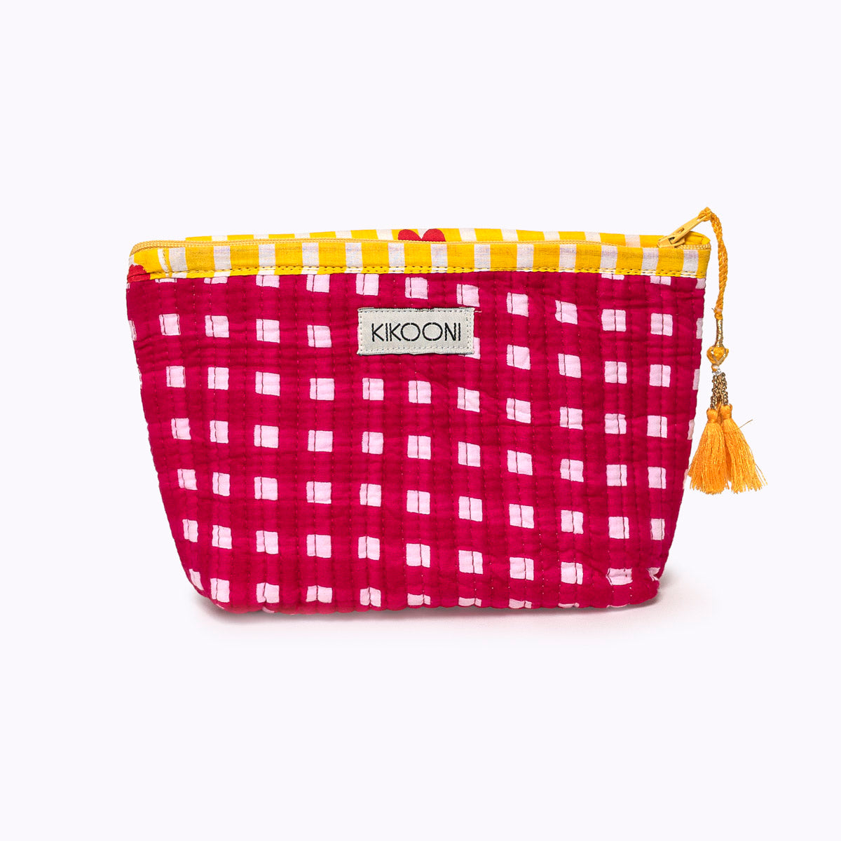 Liebevolle Handarbeit und einzigartige Details! Die verspielte und handgemachte Mini Tasche "HAPPY CHECK" pink ist eine wunderbare Ergänzung zur Kosmetiktasche, zum Shopper oder der Reisetasche. Sie macht dein Set perfekt!  Da du sie perfekt in deiner Handtasche unterbringen kannst, ist sie perfekt geeignet für Lippenstift und Handcreme, aber auch für dein Geld oder Ausweise ( auch dein Pass findet hier locker Platz!) . Du kannst sie also auch wunderbar als Geldbeutel, kleines Schmincktäschchen oder Reisebegleiter nutzen. Deiner Fantasie sind keine Grenzen gesetzt! Alle wichtigen kleinen Dinge des Lebens kannst du hier organisiert und griffbereit verwahren . Das schönste: Jedes Täschchen ist ein Einzelstück und wird mit viel Liebe in Indien hergestellt. Die Mitarbeiter bedrucken den reinen Baumwollstoff mit Holzstempeln von Hand. Dieses Verfahren wird Blockprint genannt. Anschliessend wird die Tasche mit der berühmten und traditionellen Kantha-Stickerei bestickt und mit den Quasten-Details am Reissverschluss finalisiert.  Fair, ressourcenschonend und mit kreativem Spirit