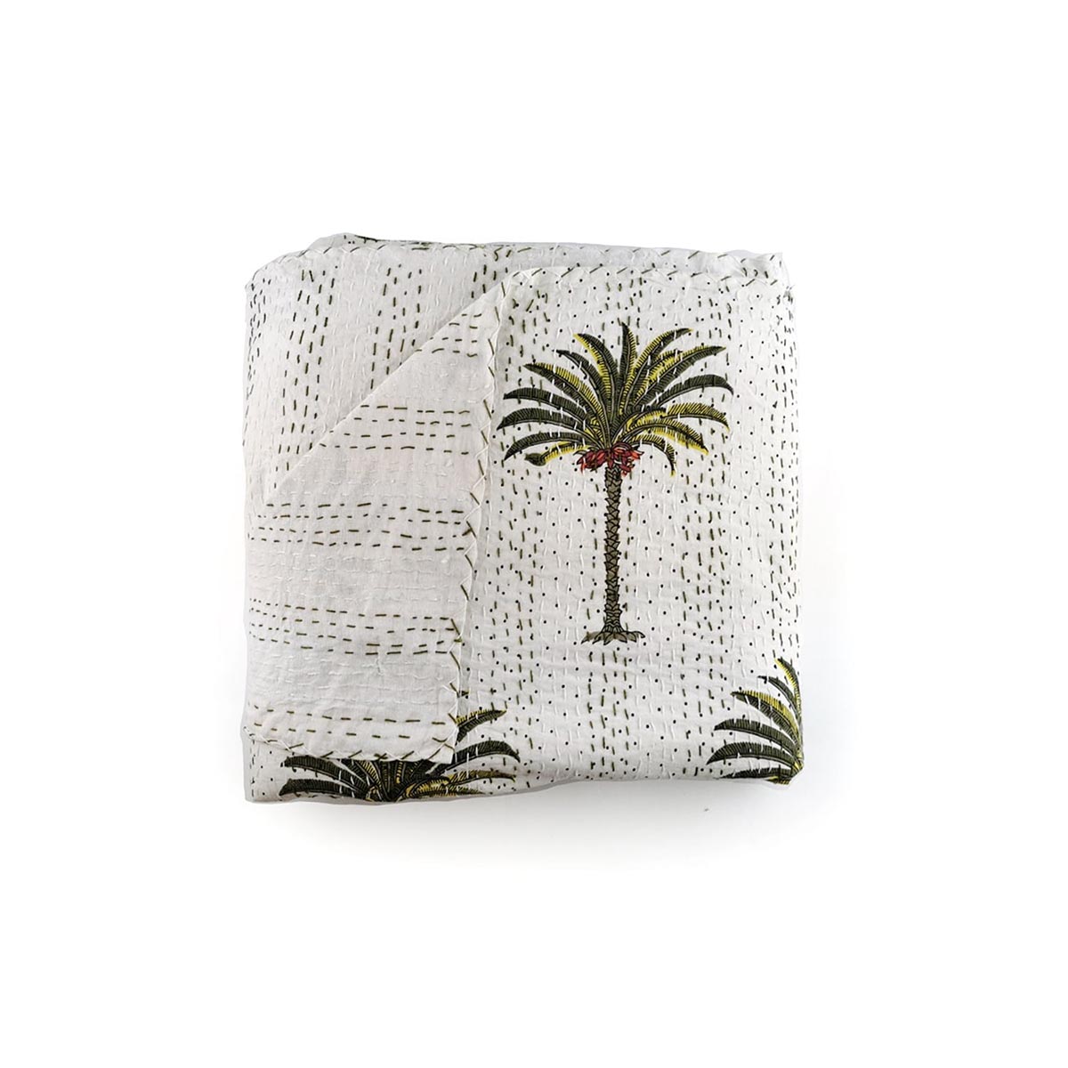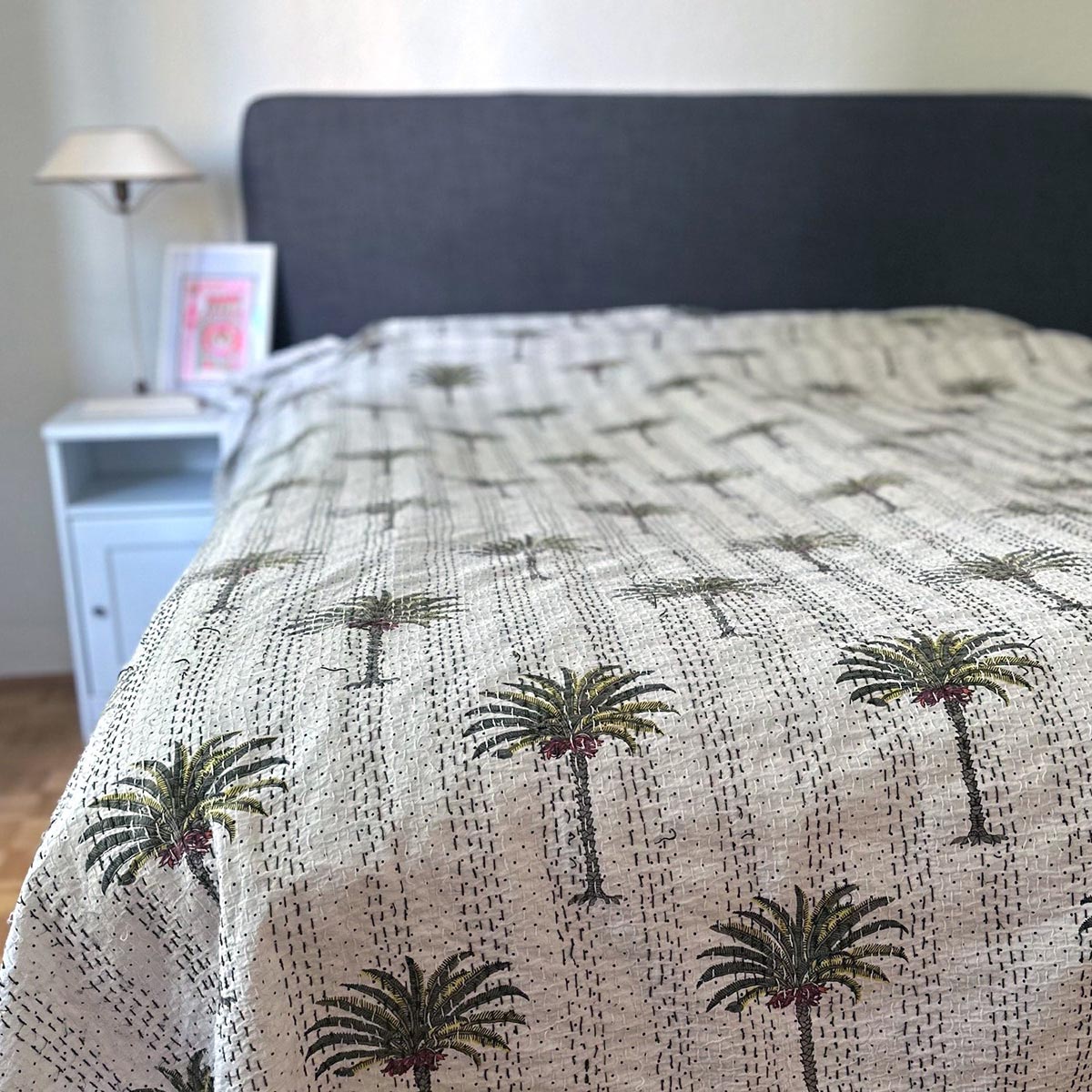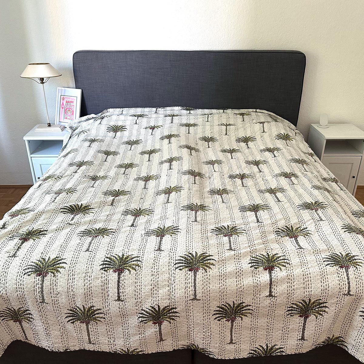 XL- Überdecke "PALMS" . Ob auf dem Sofa oder auf dem Bett – die Überdecken aus Indien verleihen dem Zuhause einen einzigartigen Charme. In den farbenfrohen Überdecken steckt viel Handarbeit, die von Kreativität und traditioneller Hingabe geprägt sind. Das Material ist aus reiner und hochwertiger Baumwolle, welche im Prozess von Hand bedruckt wird. Dafür werden eigens angefertigte Holzstempel verwendet. Später wird die traditionelle Kantha-Stickerei angewandt, welche ebenfalls Handarbeit ist und im indischen Glaube besagt, Schutz für Kinder und alte Menschen zu sein.